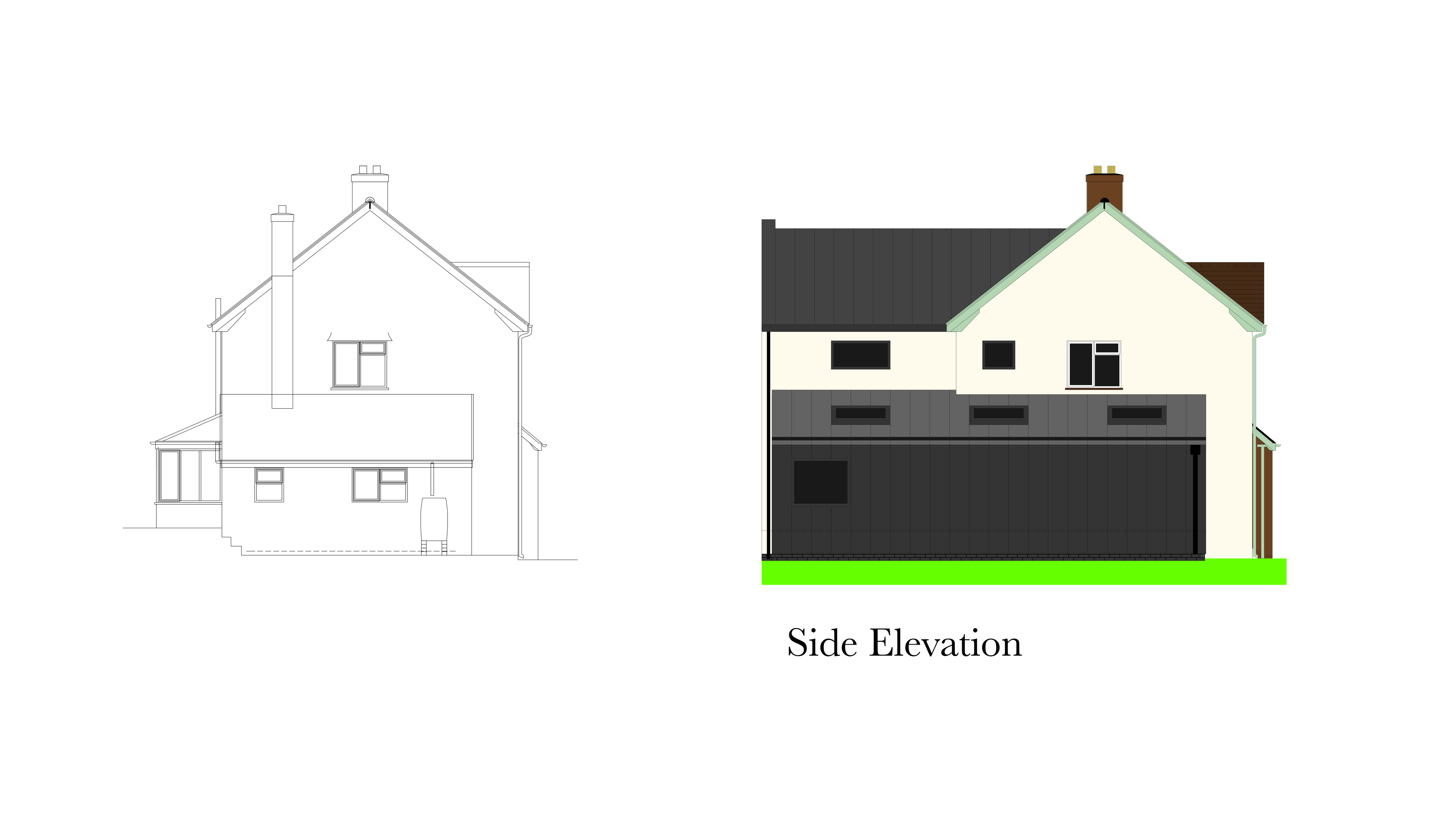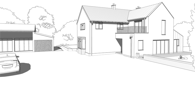 The main extension is designed in a contemporary style and uses white render to tie in with the original building. The building currently has a 'lean to' wrap around addition to the main building which we retain and enlarge to one side and clad it with zinc to echo a local vernacular of having metal clad lean to's and to also break up the main volume of the building.